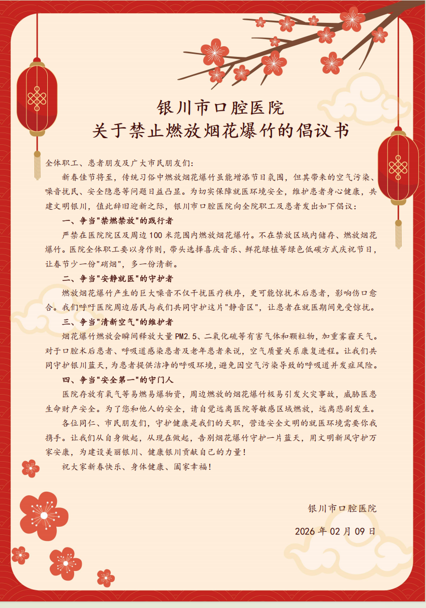 银川市口腔医院 关于禁止燃放烟花爆竹的倡议书
